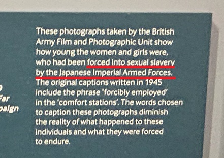 虜収容所の女性 (慰安婦) の写真には、「forced into sex slavery by the Japanese Imperial Armed Forces」(大日本帝国軍によって性奴隷になることを強制された) という説明書きが添えられています。
