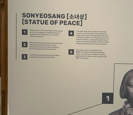 「正義と和解」のコーナーには例の少女像があります。正式には「平和の像」(Statue of Peace) と呼ぶようですね。左上には各部位の解説文が添えられています。